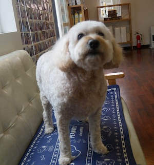 テレビの音・・・チワプー ロングコートチワワ&トイプードルMIXの 五右衛門くん。 ・・・大雨の一日。 ・・・雨音が すごすぎて。 ・・・テレビの音量、これでもか、っていうくらい 上げる。 再度 スイッチ入れた時に、すごい音でびっくり。