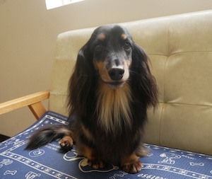 ロングヘアードミニチュアダックスフンドの マハロちゃん。