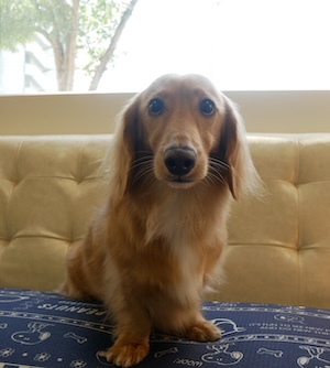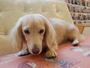 生どら・・・ダックス ロングヘアードミニチュアダックスフンドの はるくん。 ・・・今日は、生クリームの日。 ・・・普通の どらやき に 生クリームいれると。 ・・・生どら に。 大丸デパートで行列しているね。 並んでまで。。で、まだ一度も 食べられず。