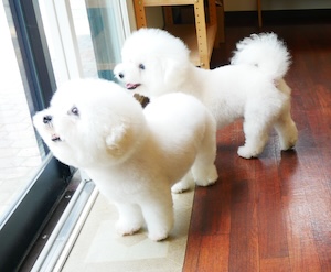チョコ生・・・ビション ビションフリーゼの ポピンくん ゆきんくん。 ・・・クリスマスケーキ 予約しないと。 ・・・チョコ がいいよ。 ・・・生クリーム がいいよ。 ・・・けんか だー。 クリスマス前の けんか材料の一つかな。