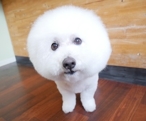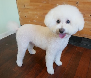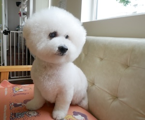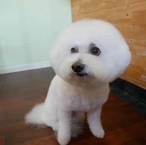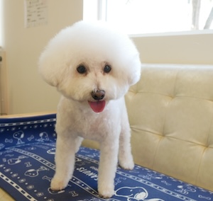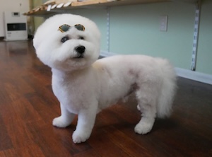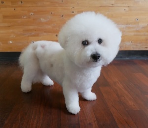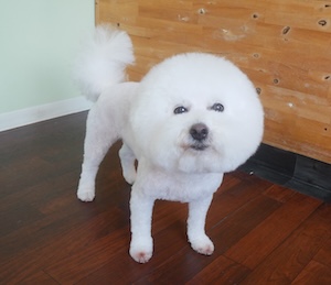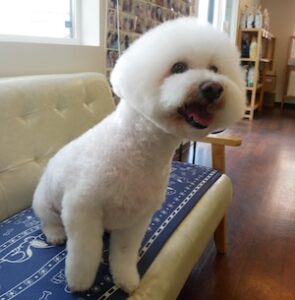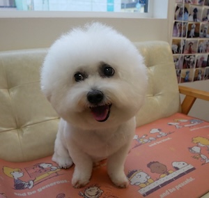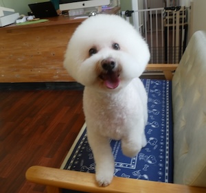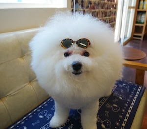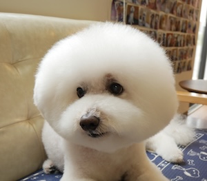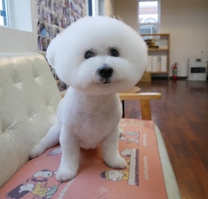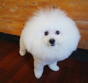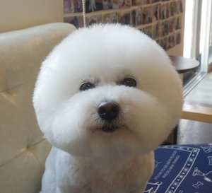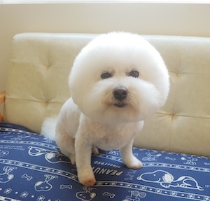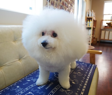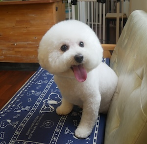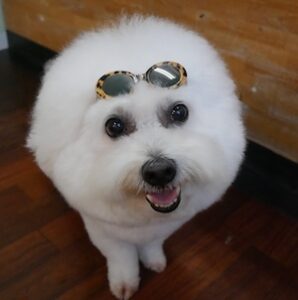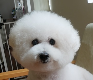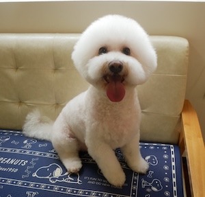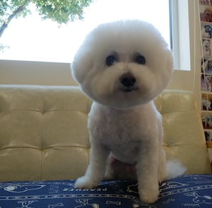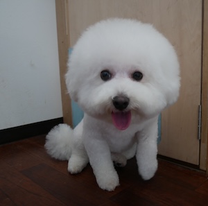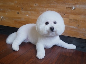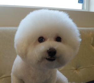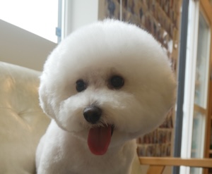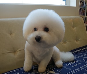 しゃがんで・・・ビション ビションフリーゼの アールくん。 ・・・今日は、はい!チーズ の日。 ・・・そこの白い人 しゃがんで。もっとしゃがんで。 ・・・なんで、ぼくばっかり。 背、低い人はね。 足。。。あんまり 長くないのが、ビションのかわいいとこ。