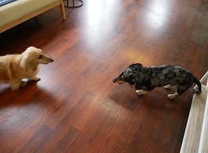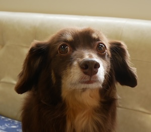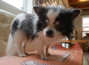 外・・・チワックス ロングコートチワワ&ロングヘアードミニチュアダックスフンドMIXの コロネちゃん。 ・・・今日は、気象予報士の日。 ・・・今日は危ないので、外出は控えて! ・・・と、いいながら 中継しているのはなぜ? 大雨に、台風に。川や海のそばで。