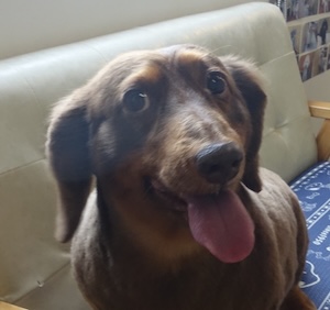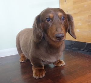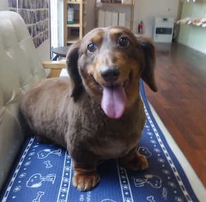 ロングヘアードミニチュアダックスフンドの カカオくん。