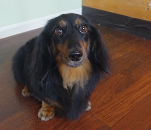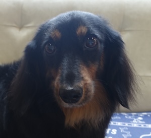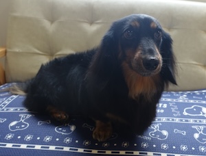 ロングヘアードミニチュアダックスフンドの チロルちゃん。