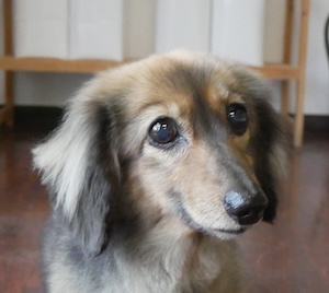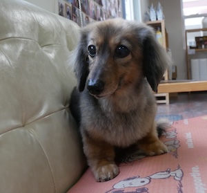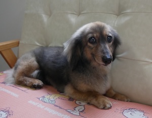 ロングヘアードミニチュアダックスフンドの モモちゃん。